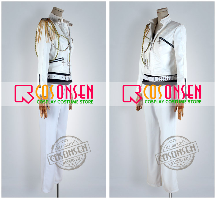 軍服スタイルの白いジャケットです。右肩には黄色いふさ飾りのある肩章がついています。二つのポケットは配置して、袖の十字架がかっこいいです。襟にはリベットがついています。