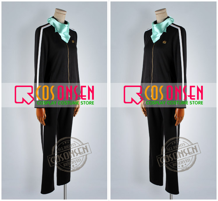 【上着】黒を基調したジャージ生地で製作した上着です。袖の両側に白いラインが付き、左胸に王冠のような徽章を飾っています。正面のファスナーで脱着して頂きます。