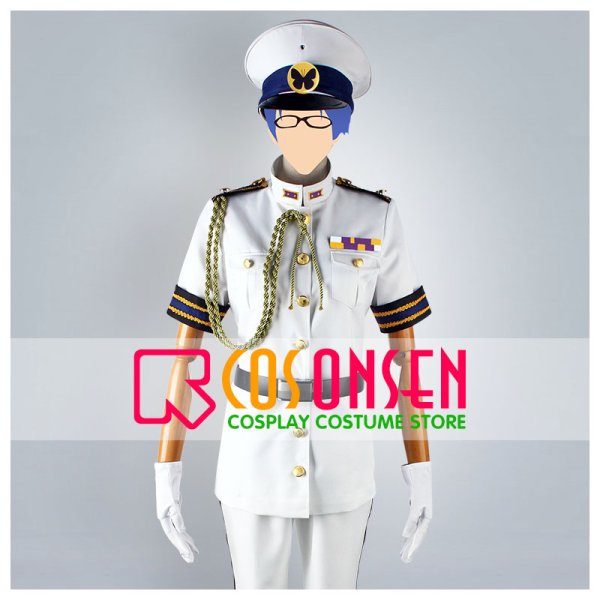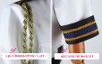 白を基調したポリ混紡生地にて製作します。軍服の様式で、格好いいイメージが溢れています。正面には金色のボタンが飾り、キラキラしています。肩には付け襟が付き、胸先と襟元に刺繍入ります。見事に原作を再現しました。