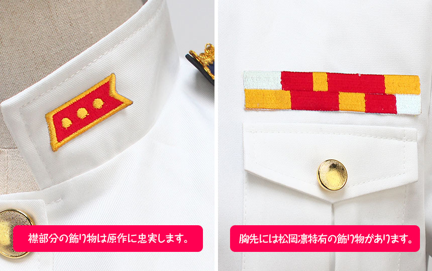 白を基調したポリ混紡生地にて製作します。軍服の様式で、格好いいイメージが溢れています。正面には金色のボタンが飾り、キラキラしています。肩には付け襟が付き、胸先と襟元に刺繍入ります。見事に原作を再現しました。