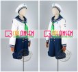 白を基調したポリ混紡生地にて製作します。海軍服の様式で、格好いいイメージが溢れています。緑のネクタイで見事に原作を再現しました。