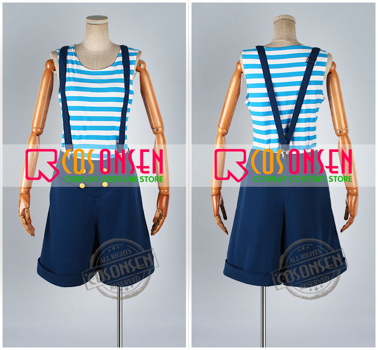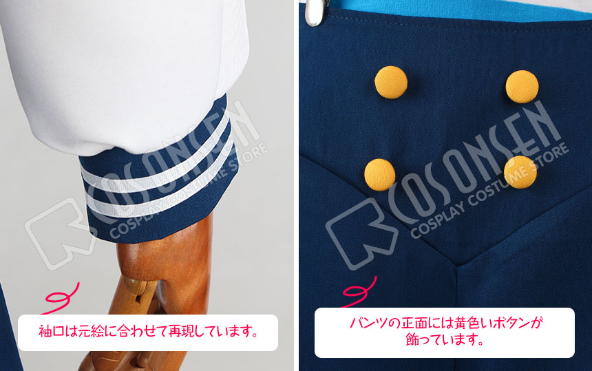 白を基調したポリ混紡生地にて製作します。海軍服の様式で、格好いいイメージが溢れています。黄色のネクタイで見事に原作を再現しました。