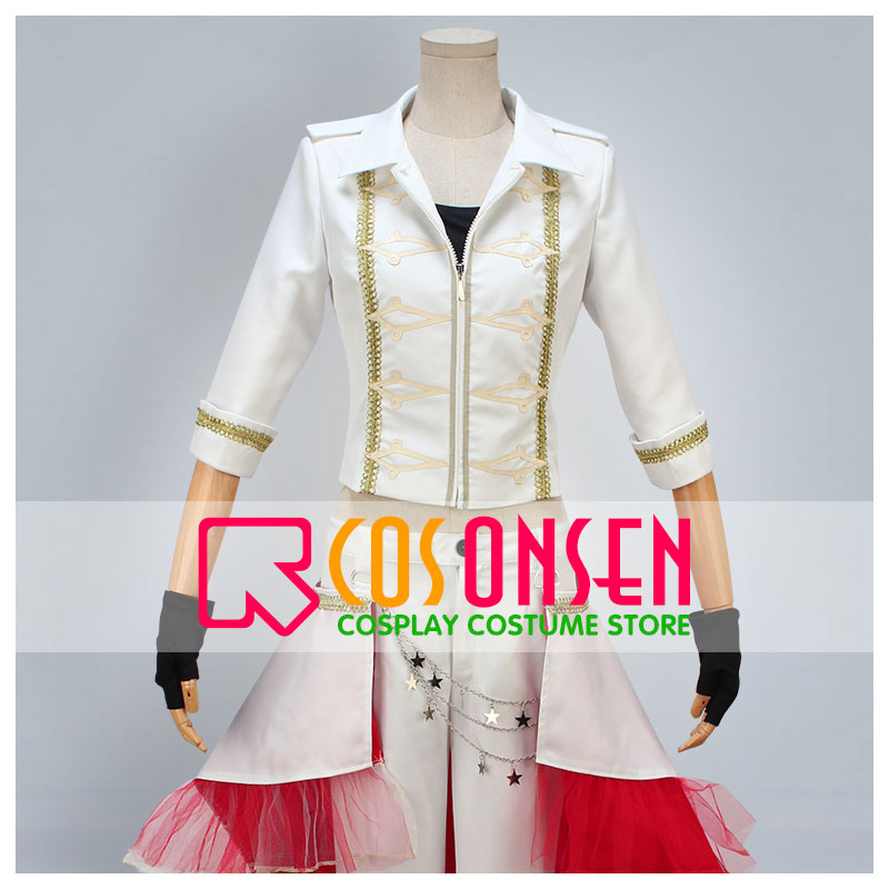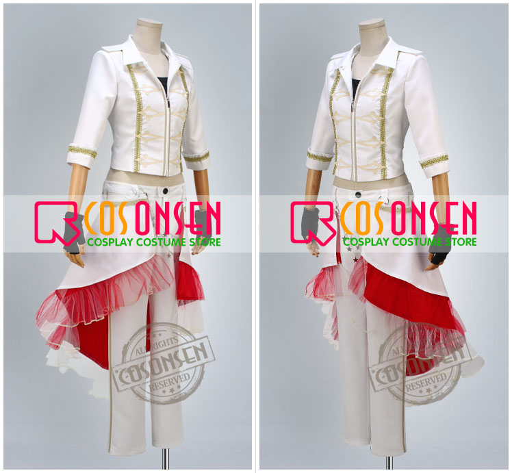 白を基調したポリ混紡生地にて製作します。スカートのような部分はステージ風の感じで、原作を完璧的に再現します。