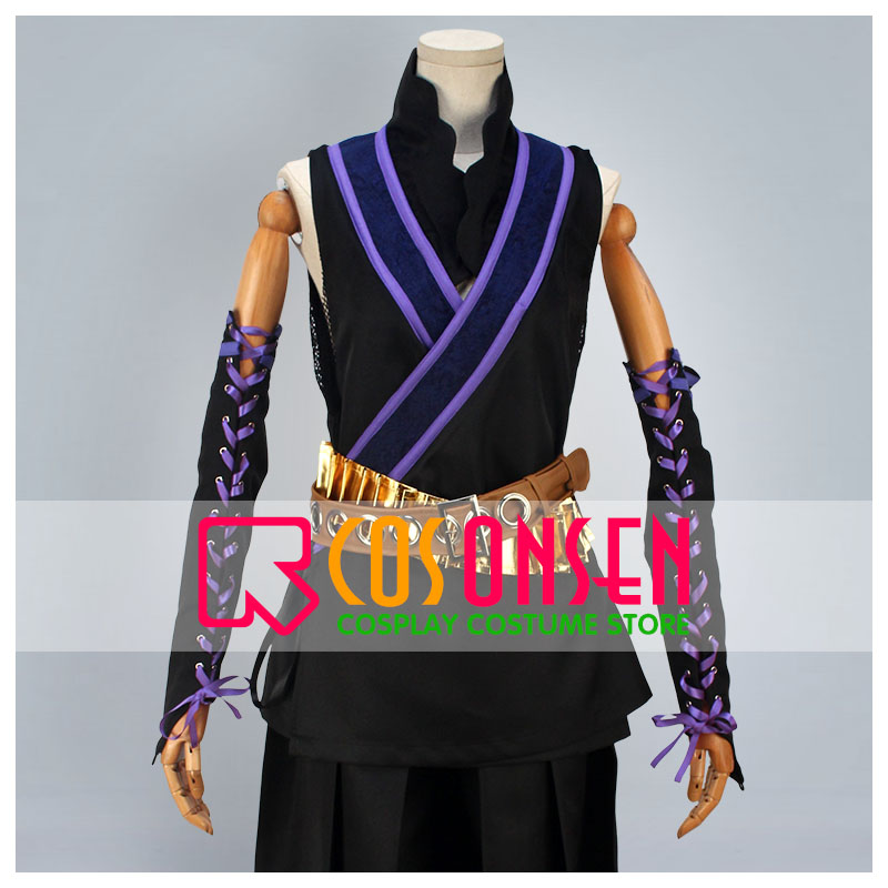 【ジャンル】:大人気なアニメ・曇天に笑う 金城白子忍服 コスプレ衣装 COSONSEN 【セット内容】:計4点 上着、袴、飾り物(アームカバー、ベルト) 【素材】:ポリ混紡生地、合皮生地 商品詳細: 【上着】 黒を基調したポリ混紡生地にて製作します。立て襟が付き、周りは紫色のラインがあって、格好良いと感じます。見事に原作を再現しました。 【袴】 黒を基調したポリ混紡生地にて製作します。プリーツのデザインで立派な感じがします。 【飾り物(アームカバー、ベルト)】 アームカバーとベルトが付属します。