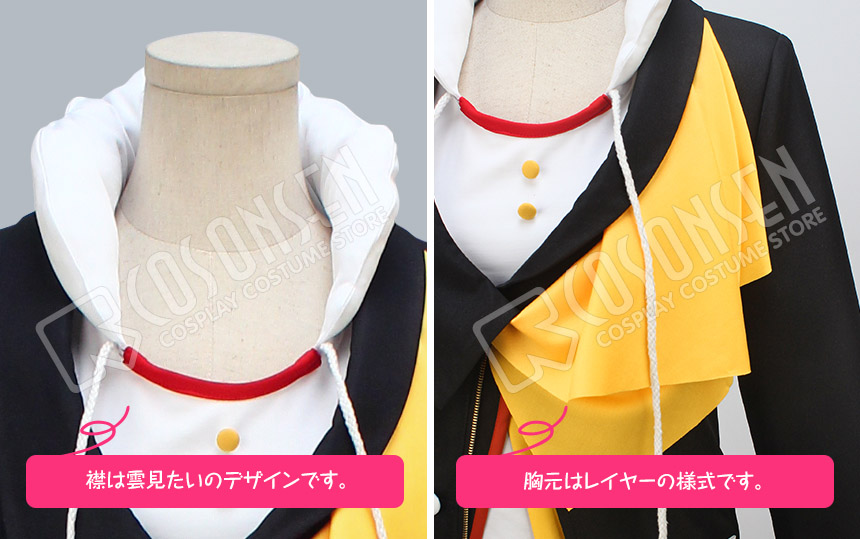 黒を基調したポリ混紡生地にて製作します。左胸に黄色のシフォン生地にて製作されて飾りがあって、とても綺麗に見えます。左袖口に白いボタン付き、右袖口の方が黄色と白のライン付き、不対称のデザインで、とても目立ちます。正面はファスナーとボタンが付き、脱着が簡単にできます。