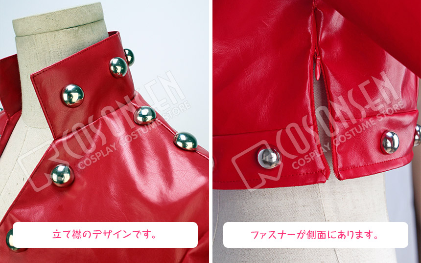 赤を基調したポリ合皮生地にて製作します。ズボンにボタンが付き、元絵を完璧に再現しました。正面のボタンとファスナーで着脱して頂きます。