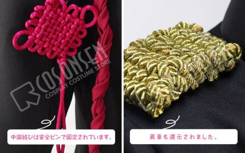 黒を基調したポリ混紡生地にて製作します。表は黒で、裏は赤で、とても格好良いイメージが溢れます。肩章も付いております。袖には金色の綺麗な柄がプリントされております。