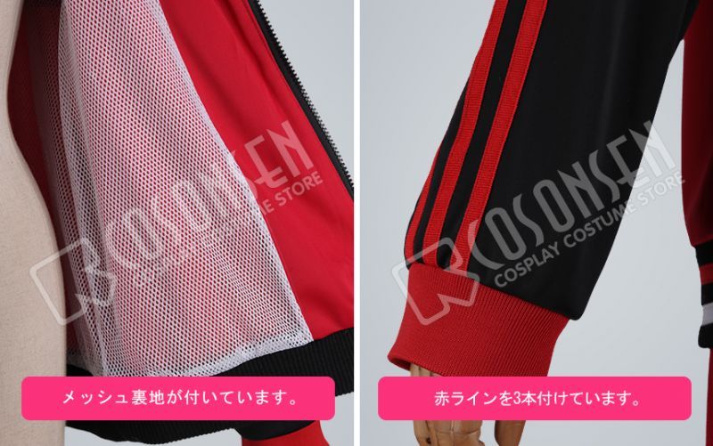 黒と赤を基調したジャージ生地にて製作します。元絵に忠実な徽章がプリントされています。ファスナー付きのデザインで簡単に脱着できます。両袖に赤いラインがあって、スポーツ雰囲気満々です。