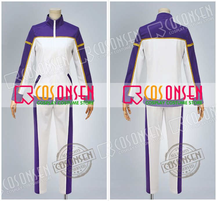 白と紫を基調したジャージ生地にて製作します。サテン生地のラインが付き、クオリティが高いです。さっぱりした感じが溢れています。正面はファスナーを使い、脱着が簡単にできます。