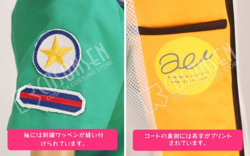 青緑を基調したポリエステルにて製作します。袖と胸元に刺繍ワッペン、肩にバッジが縫い付きます。星のボタンが一つあります。
