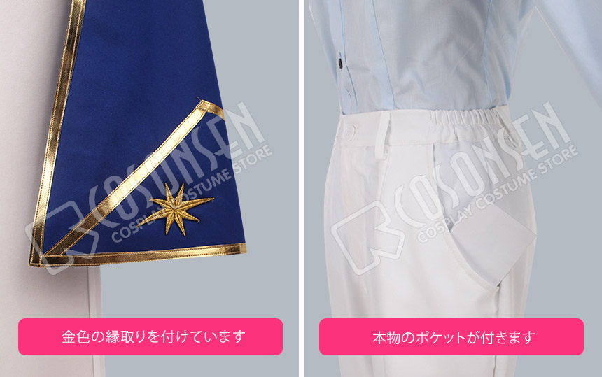 紺色を基調したポリ混紡にて製作します。衣装の周りに金色のラインが飾ってあります。胸には胸飾りが付き、襟には星飾りが飾ってあります。袖口は折り返しの状態で、長い後ろ裾はとてもかっこいいです。