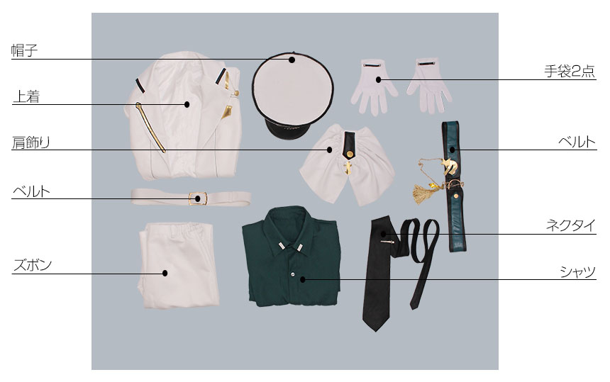 上着、シャツ、ズボン、飾り物(帽子、肩飾り、ネクタイ、ベルト2点、手袋2点)