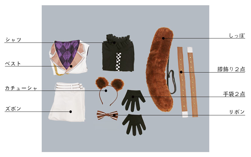 ベスト、シャツ、ズボン、飾り物(カチューシャ、リボン、手袋2点、腰飾り2点、しっぽ、膝飾り2点)
