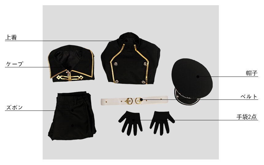 ケープ、上着、ズボン、飾り物(ベルト、帽子、手袋2点)