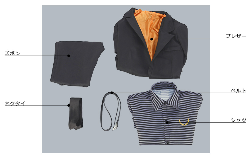ブレザー、シャツ、ズボン、飾り物(ネクタイ、ベルト)