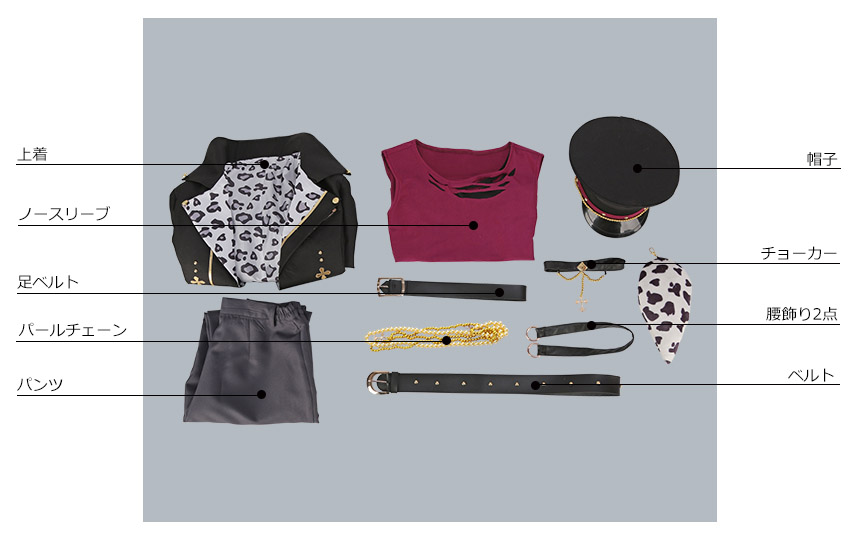 帽子、チョーカー、ベルト、腰飾り2点、パールチェーン、足ベルトも付属しています。
