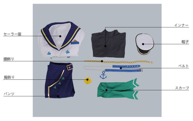 セーラー服、インナー、パンツ、飾り物(スカーフ、帽子、胸飾り、腰飾り、ベルト)