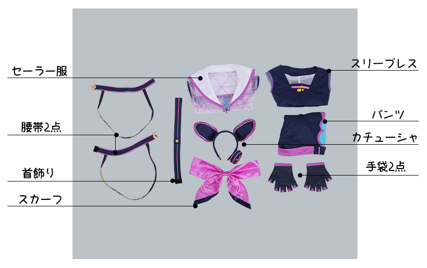 カチューシャ、首飾り、スカーフ、手袋2点、腰帯2点も付属しています。