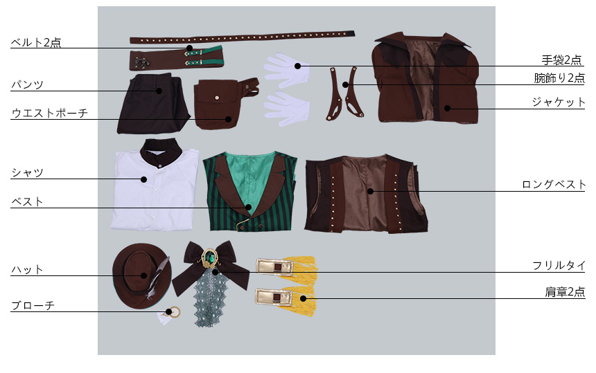 ジャケット、ロングベスト、ベスト、シャツ、パンツ、飾り物(ハット、フリルタイ、肩章2点、手袋2点、腕飾り2点、ベルト2点、ウエストポーチ、ブローチ)