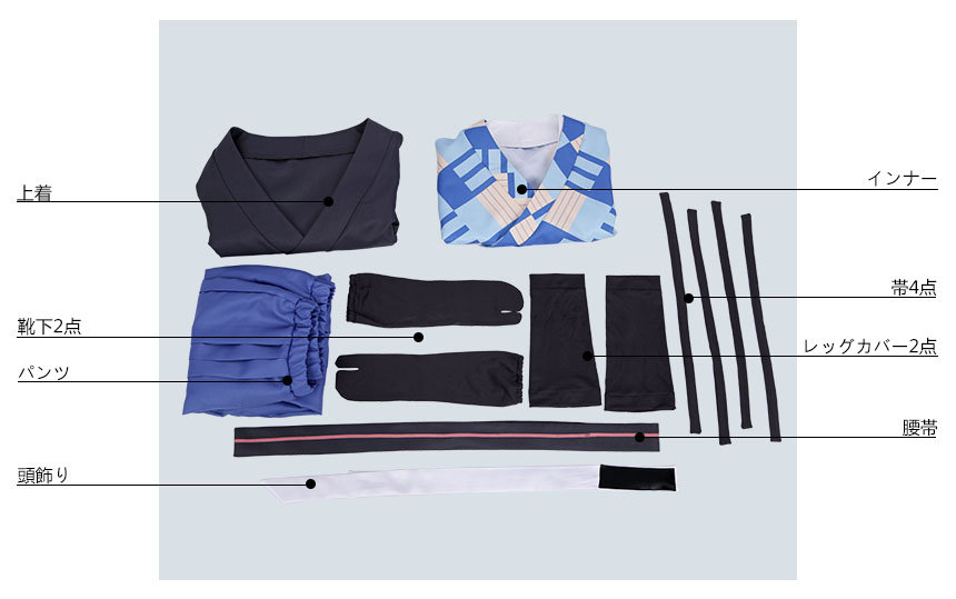 レッグカバー2点、頭飾り、腰帯、帯4点、靴下2点も付属しています。