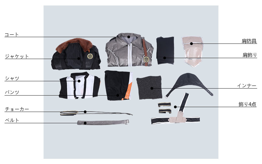 コート、ジャケット、シャツ、インナー、パンツ、飾り物(肩飾り、肩防具、ベルト、チョーカー、飾り4点)